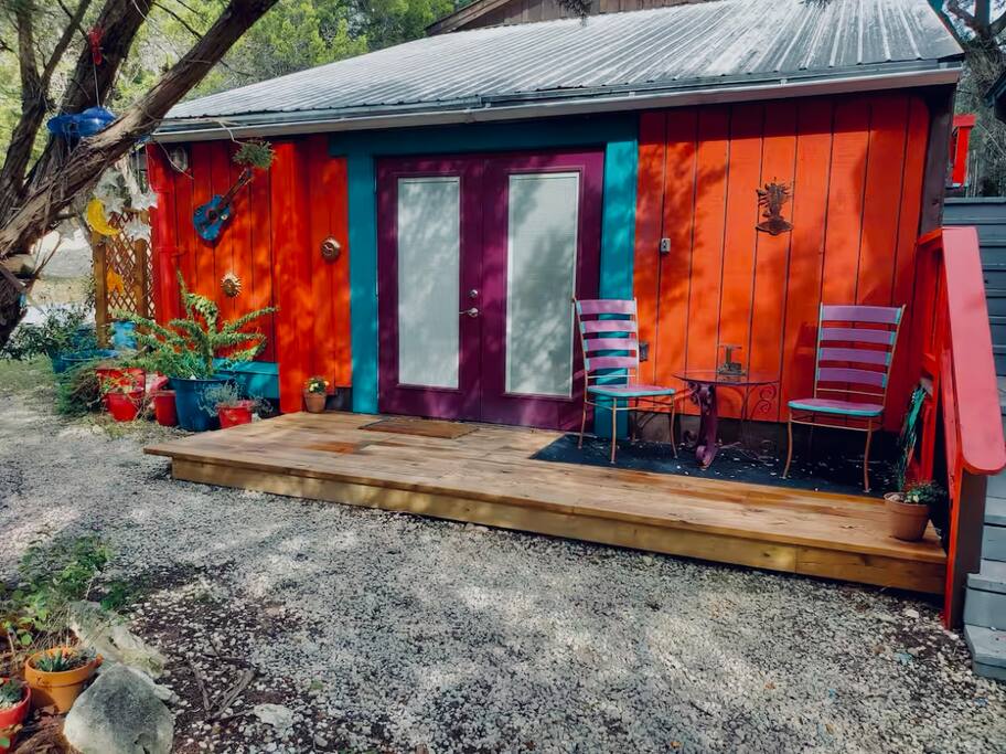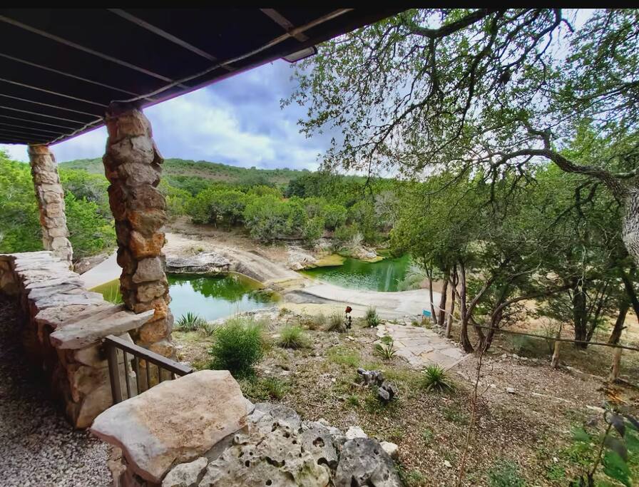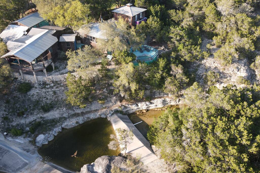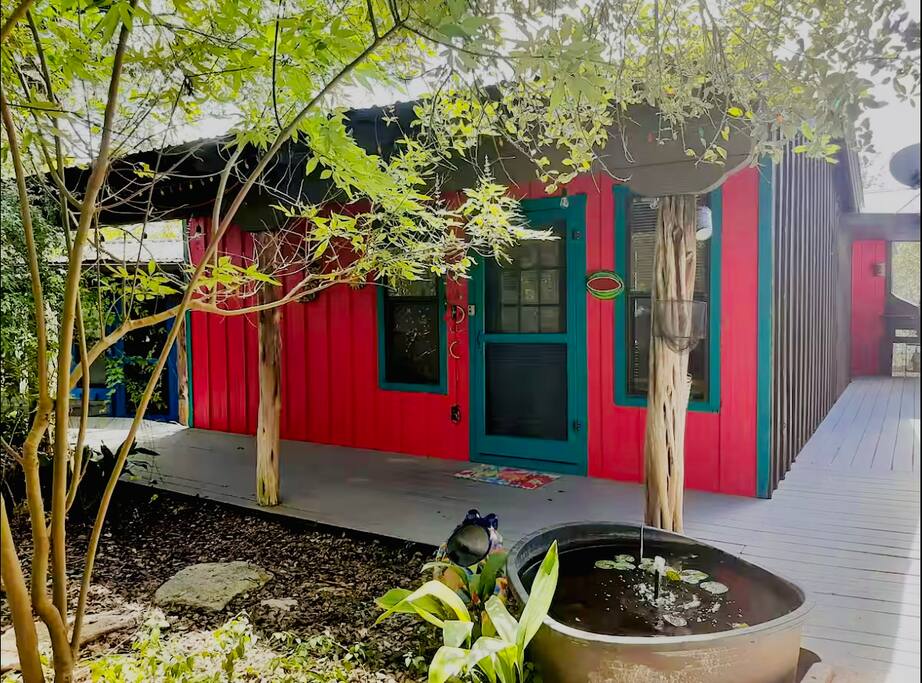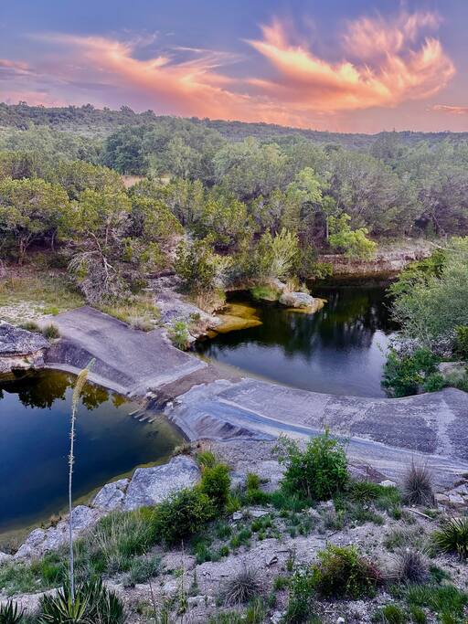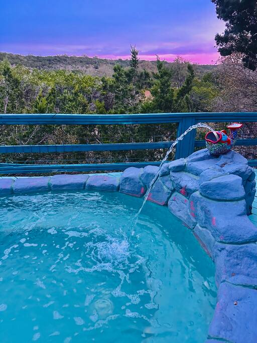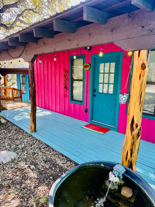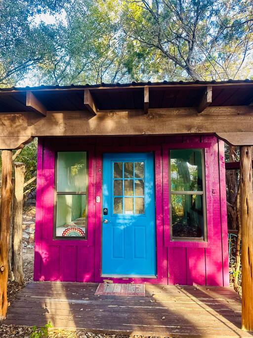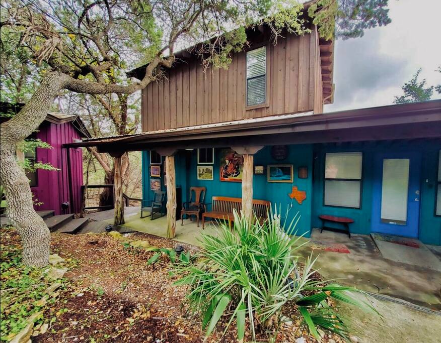Wanting a grand and relaxing getaway? This booking guarantees you and your group have our whole property to yourselves! Our property is broken up by three main houses (each house included in individual photo description) Each main house is set up with a reverse osmosis system for all of your cooking and drinking pleasure! The first is our treetop home which is a 2 bedroom (both king beds) 2.5 bathroom home and our largest home. It comes with a fully equipped kitchen, living room, and indoor fireplace. The upstairs bedroom also has a balcony with views of the hills and plunge pool as well as an additional outdoor patio space in the front. The treetop home also has two sleeper sofas and an air mattress upon request. This unit can comfortably fit 6-8 guests. The second is our watermelon house, which is a medium sized 1 bedroom (king bed) with 2 bathrooms home. This house has a walk out balcony, with great views of the creek and rolling hillside and also comes with a fully equipped kitchen, living room, and sleeper sofa. The final is our casita, the smallest house with a king bedroom, bathroom, kitchen and living room. Think of this as a mother in law suite! There are also two very small “bunkhouses” available, each with a twin bed, mini refrigerator, wifi, and air conditioning. If interested in access, please inquire and we can provide additional details and pricing options. In our outdoor space, we have a plunge pool, multiple grills, a fireplace, multiple areas to relax outdoors, as well as a private swimming hole in the creek below (please note the main creek access is private property, but we have our own area indicated by signs when you head down). Each home is accessible by multiple walkways in both the front and backyard. Lastly, we are planning some major and exciting updates to our oasis, stay tuned!